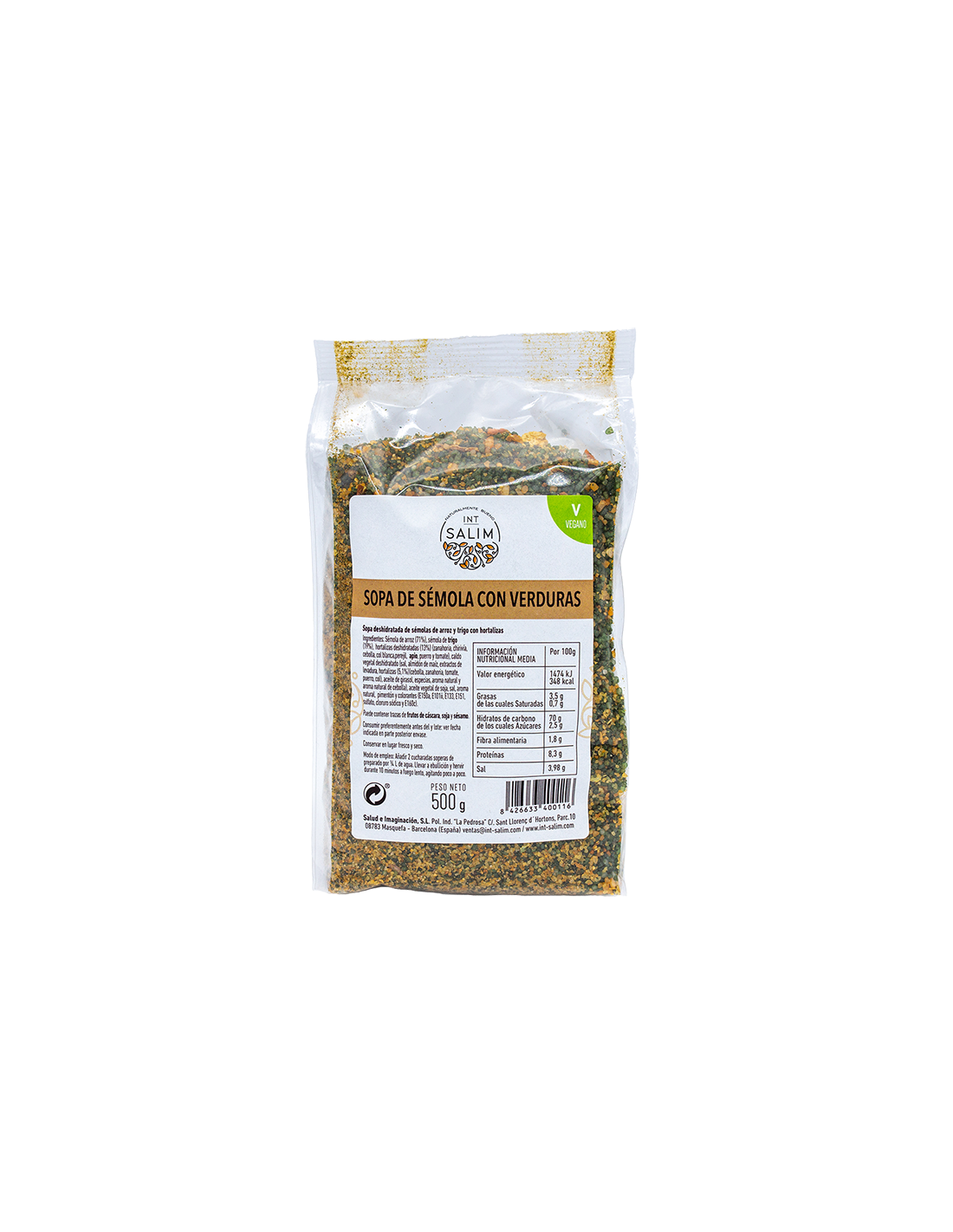Ingredientes: Sémola de arroz (71%), sémola de trigo (19%), verduras deshidratadas (13%) (zanahoria, chirivía, cebolla, col blanca,perejil, apio, puerro y tomate), caldo vegetal deshidratado (sal, almidón de maíz, extractos de levadura, hortalizas (5,1%)(cebolla, zanahoria, tomate, puerro, col), aceite de girasol, especias, aroma natural y aroma natural de cebolla), aceite vegetal de soja, sal, aroma natural, pimentón en polvo y colorantes (E150a, E101ii, E133, E151, sulfato, cloruro sodico y E160c).